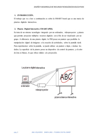 Este documento describe los recursos tecnológicos educativos relacionados con la pizarra digital interactiva SMART. Explica que la pizarra SMART permite proyectar recursos digitales de forma interactiva utilizando un puntero o lápiz táctil. También describe los modelos de pizarras SMART, el software SMART Notebook y sus herramientas, así como recursos y tutoriales para trabajar con la pizarra digital SMART en el aula.