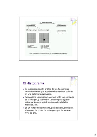 El documento describe diferentes técnicas de procesamiento digital de imágenes como mejora de imágenes, histograma, aumento y disminución de brillo, corrección de contraste, funciones de transformación, ecualización de histograma, filtrado espacial y de ruido. Explica conceptos como histograma, función de transferencia, kernel, convolución y cómo estas técnicas se pueden aplicar para mejorar atributos de una imagen como brillo, contraste y eliminar ruido.