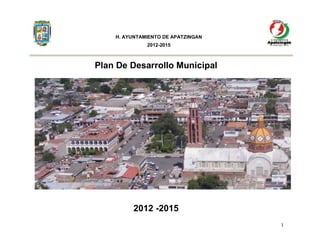 Este documento presenta el Plan de Desarrollo Municipal 2012-2015 del municipio de Apatzingán, Michoacán. Incluye información sobre la misión, visión, autoridades municipales, marco legal, perfil socioeconómico y demográfico del municipio, así como los cuatro ejes estratégicos del plan: desarrollo institucional, desarrollo económico sostenible, desarrollo social incluyente y desarrollo ambiental sustentable. El objetivo general es mejorar las condiciones de vida de los habitantes de Apat