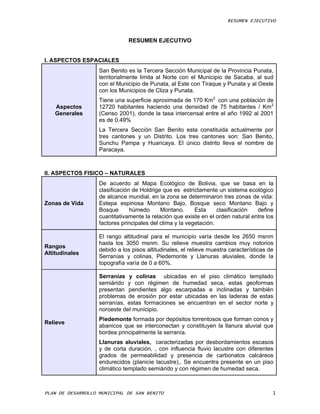 Este documento presenta un resumen ejecutivo del Plan de Desarrollo Municipal de San Benito para el período 2003-2007. San Benito se encuentra en la provincia de Punata y tiene una población de aproximadamente 12,720 habitantes. El plan describe la ubicación, aspectos físicos, socioeconómicos y productivos del municipio. La agricultura y la ganadería son las principales actividades económicas. El plan tiene como visión estratégica fortalecer las capacidades locales a través del desarrollo técnico y administrativo de