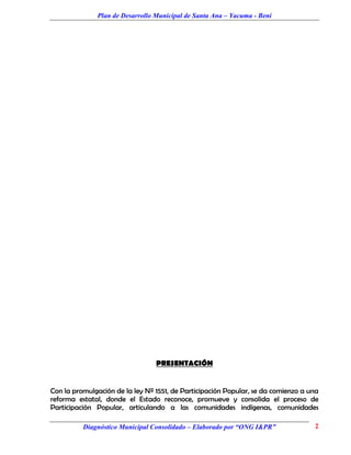 Este documento presenta el Plan de Desarrollo Municipal de Santa Ana en la provincia de Yacuma, Beni para el período 2008-2012. Explica la metodología de planificación participativa utilizada para formular el plan con la participación de las comunidades locales. Incluye información sobre la ubicación geográfica de Santa Ana, sus límites territoriales y los actores involucrados en el proceso de planificación como el gobierno municipal, comités de vigilancia y ONG que elaboró el plan.