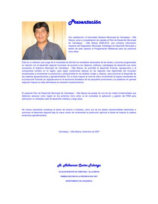 Este documento presenta el Plan de Desarrollo Municipal de Camataqui-Villa Abecia para el período 2008-2012. El plan tiene como objetivo principal promover el desarrollo regional a través del incremento de la producción agrícola y mejorar la cadena productiva agroalimentaria, con un enfoque en el desarrollo frutícola, agropecuario y turístico. El documento describe el proceso de diagnóstico participativo realizado con las comunidades para identificar problemas, potencialidades y prioridades de desarrollo.