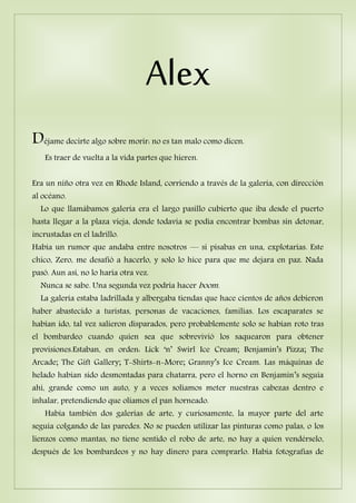 Este documento cuenta la historia de un hombre recordando su pasado. Describe su infancia en Rhode Island y su mudanza a Maine. Luego quema una casa vacía y es encarcelado, donde sufre abusos. Aprende a sobrevivir en la cárcel reviviendo recuerdos de su vida. Finalmente recuerda a una mujer llamada Lena, por quien lucha para seguir adelante.