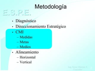 El documento presenta una metodología para la gestión de proyectos que incluye diagnóstico, direccionamiento estratégico, cuadro de mando integral, alineamiento horizontal y vertical. Explica el mapa estratégico por perspectiva y el cuadro de mando integral. Luego describe los medios, objetivos, líneas de base y metas para incrementar la participación de mercado. Finalmente, detalla los pasos para materializar la misión de una organización a través de la asignación de recursos y la conversión de acciones estratégicas en