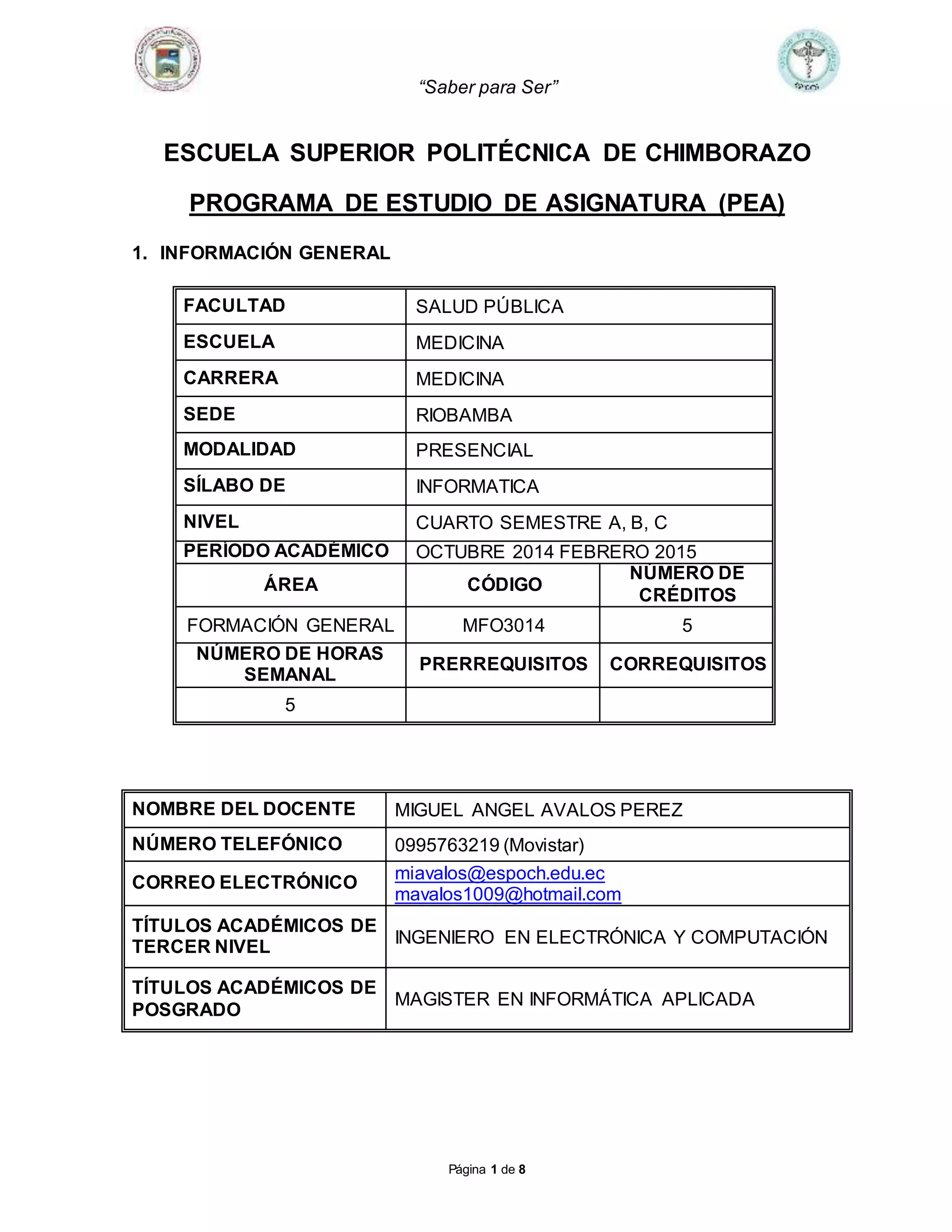 Este documento presenta el programa de estudio de la asignatura de Informática para estudiantes de cuarto semestre de la carrera de Medicina. El curso se enfoca en enseñar el uso de herramientas informáticas y de software como Word, Excel y Google Drive. El documento describe los objetivos del curso, los contenidos de las unidades incluyendo temas como hardware, redes sociales y trabajo colaborativo, y los métodos de evaluación.