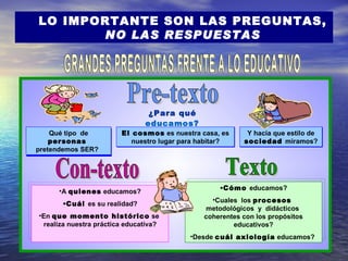 El documento presenta varias preguntas fundamentales sobre temas como el ser humano, el universo, la realidad, el sentido de la vida y la muerte. Plantea preguntas sobre por qué hacemos las cosas, a dónde vamos, qué es lo absoluto y permanente en medio del cambio. Busca generar reflexión sobre el propósito de la educación y el tipo de personas y sociedad a las que apunta.
