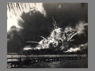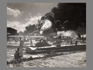 Este documento presenta fotografías recientemente descubiertas de Pearl Harbor tomadas el 7 de diciembre de 1941 por un marinero a bordo del USS Quapaw. Las fotos capturan el ataque sorpresa japonés y muestran los daños infligidos a los buques estadounidenses. El documento también proporciona detalles sobre las bajas estadounidenses y la extensión de los daños a los buques de guerra y aeronaves durante el ataque.