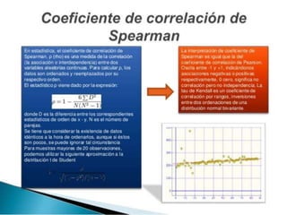 El documento explica los coeficientes de correlación de Pearson y Spearman. El coeficiente de Pearson mide la relación lineal entre dos variables cuantitativas, mientras que el coeficiente de Spearman mide la asociación entre dos variables al ordenar los valores y es útil cuando los datos no siguen una distribución normal. Ambos coeficientes varían de -1 a 1, donde valores cercanos a 1 indican una fuerte correlación positiva o negativa.