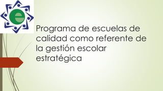 Este documento describe el Programa de Escuelas de Calidad (PEC) en Bolivia. El PEC tiene como objetivo mejorar los resultados educativos mediante la transformación de la gestión escolar estratégica, promoviendo la toma de decisiones compartida, el liderazgo compartido y la participación social. Una escuela de calidad se define por su enfoque en la evaluación para la mejora continua. El PEC ha sido evaluado externamente y se ha encontrado que promueve la importancia de todos los actores educativos.