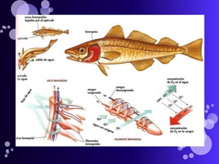 El documento describe los sistemas respiratorio, digestivo, excretor, circulatorio y locomotor de los peces. Los peces realizan el intercambio gaseoso principalmente a través de las branquias, y algunos también pueden absorber oxígeno a través de la piel o pulmones. Los sistemas circulatorio, excretor y digestivo cumplen funciones vitales como la circulación de la sangre, eliminación de desechos y digestión de alimentos. Las aletas les permiten moverse en el agua de manera eficiente.