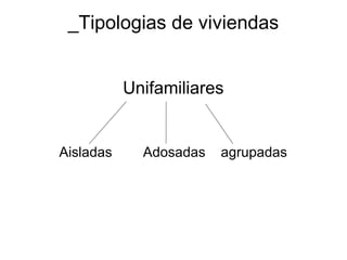 El documento describe tres tipologías de viviendas unifamiliares - aisladas, adosadas y agrupadas - y analiza proyectos de viviendas plurifamiliares de Le Corbusier y Alvar Aalto que incluyen bloques lineales, dos bloques y torres. Además, presenta estudios de sombras de diferentes configuraciones de bloques.