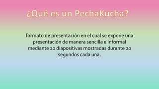 PechaKucha es un formato de presentación en el que se muestran 20 diapositivas durante 20 segundos cada una, para un total de 6 minutos y 40 segundos por presentación. Fue creado en Tokio en 2003 para permitir a emprendedores compartir sus trabajos. Se ha extendido a más de 80 ciudades y normalmente consta de 14 presentaciones sobre diseño, arquitectura, fotografía y arte.