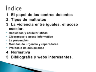 Este documento describe los tipos de maltrato infantil, incluyendo el maltrato físico, negligencia, maltrato psicológico y sexual. También discute el acoso escolar y ciberacoso, así como los roles y responsabilidades de los centros educativos en la detección y prevención del maltrato infantil. Finalmente, resume la normativa legal relevante y recursos bibliográficos adicionales.