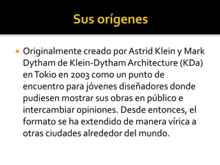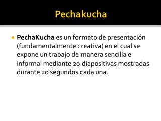 PechaKucha es un formato de presentación en el que se muestran 20 diapositivas durante 20 segundos cada una, para un total de 6 minutos y 40 segundos por presentación. Fue creado en 2003 en Tokio para que diseñadores compartieran sus trabajos. Desde entonces se ha extendido a más de 80 ciudades globalmente. El formato mantiene alta la atención del público a través de presentaciones muy concisas y permite compartir ideas de varios presentadores en una noche.