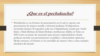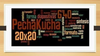 Pechakucha es un formato de presentación de 20 diapositivas mostradas durante 20 segundos cada una, creado originalmente en Tokio en 2003 para permitir presentaciones concisas e intercambio de ideas. Se ha extendido a nivel mundial. Las presentaciones de Pechakucha duran 6 minutos y 40 segundos para mantener la atención del público a lo largo de la noche. Los temas suelen ser de diseño, arquitectura, arte y recientemente negocios y software.