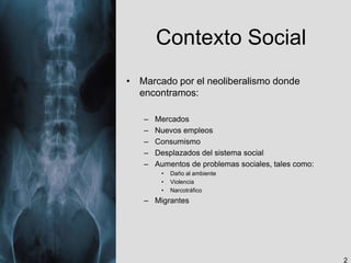 El documento describe el contexto social marcado por el neoliberalismo y los problemas que ha generado como la violencia y el narcotráfico. También analiza los escenarios futuros de la radio con la digitalización y cambios en los hábitos de audiencia, así como nuevos escenarios para la educación a través de plataformas virtuales y teléfonos celulares. Finalmente, identifica demandas de los nuevos oyentes como la educación permanente y la comunicación ante desastres, y realiza un diagnóstico sobre la necesidad de analizar ingresos y
