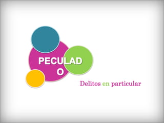 El documento describe el delito de peculado en México. Define peculado como cuando un servidor público distrae dinero u otros bienes pertenecientes al estado o a particulares para su propio uso o el de otros. Explica que el peculado ha existido históricamente en España, Roma y la Edad Media, y actualmente está regulado en el Código Penal mexicano. Se clasifica el peculado y se describen las sanciones correspondientes.