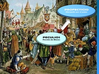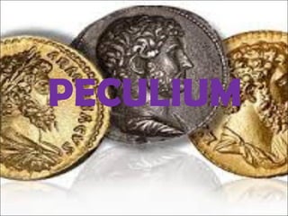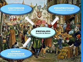 El documento habla sobre el peculio, que era una pequeña cantidad de dinero o patrimonio separado de las cuentas del padre que tenía un hijo. Había diferentes tipos de peculio, incluyendo el peculio profecticio que era el capital que el padre le daba al hijo para que se independizara, el peculio castrense que correspondía a los bienes adquiridos por el hijo durante el servicio militar, el peculio quasi castrense para bienes similares al castrense pero de otras actividades, y el peculio bona materna que correspondía
