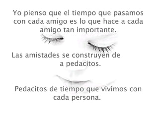 El documento describe cómo las amistades se construyen a través del tiempo de calidad que pasamos con otras personas, no necesariamente la cantidad de tiempo. Incluso cinco minutos pueden ser más importantes que un día entero si el tiempo es de calidad. Las amistades se forman de diversas maneras como risas compartidas, escuela, salidas o simplemente por simpatía mutua. Lo que hace que un amigo sea importante es saber aprovechar cada minuto juntos y tener esos recuerdos incluso cuando la persona está lejos.