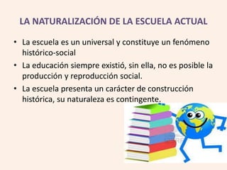 El documento describe la evolución de la educación e institucionalización escolar a través de la historia. Explica que la educación siempre ha existido para transmitir los conocimientos necesarios entre generaciones, pero que las prácticas educativas han ido cambiando y naturalizándose. Luego detalla diferentes modelos educativos desde las primeras sociedades hasta la actualidad, mostrando cómo se han ido institucionalizando en respuesta a cambios socioculturales. Concluye que la escuela es una construcción histórica que ha contribuido a configurar la idea