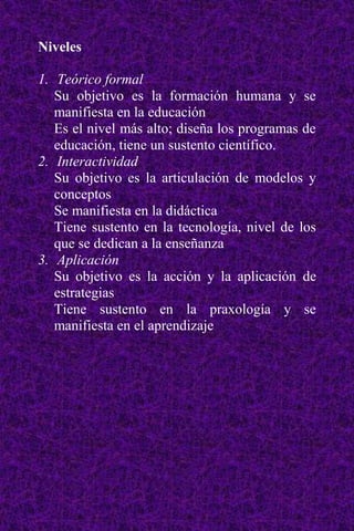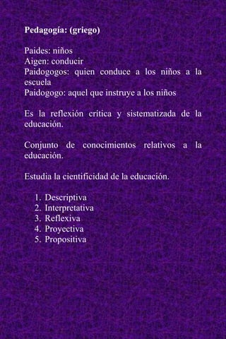 La pedagogía estudia la educación de manera crítica y sistemática. Se compone de conocimientos relacionados con la educación y analiza la cientificidad del proceso educativo. Examina la educación a través de enfoques descriptivos, interpretativos, reflexivos, proyectivos y propositivos.