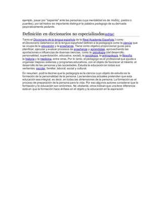 La pedagogía es la ciencia que estudia la educación y su objetivo de formar ciudadanos para una sociedad. Analiza la educación desde perspectivas de otras ciencias como la historia, sociología y psicología. La pedagogía busca incorporar a las personas a una sociedad mediante la educación para permitir el desarrollo pleno del ser humano.