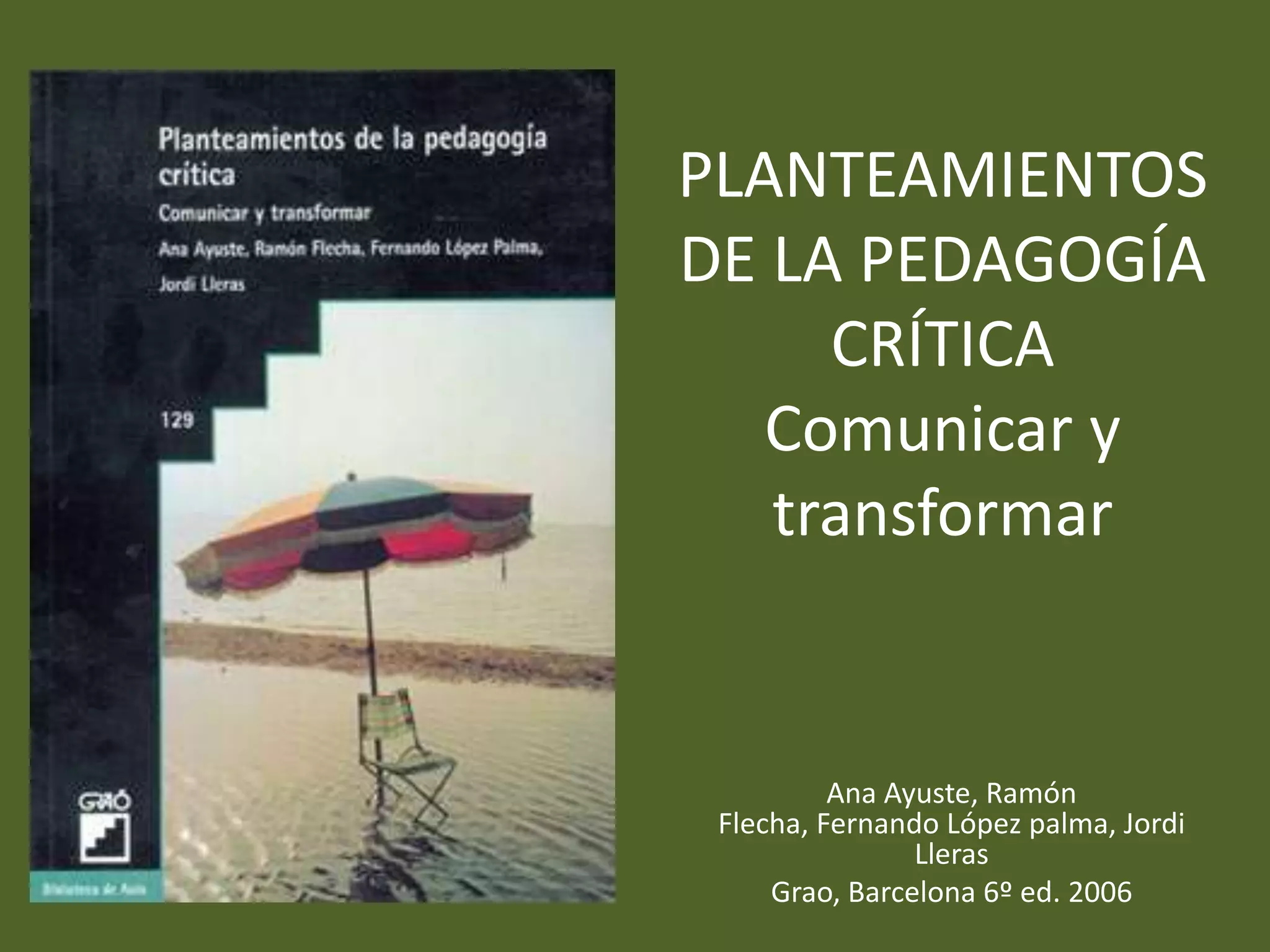 El documento discute la evolución de la pedagogía crítica, abarcando diversas corrientes educativas y su impacto en la sociedad contemporánea. Se analizan los enfoques de educadores como Montessori y Freire, destacando la importancia del diálogo y la inclusión social en la educación. Además, se enfatiza la necesidad de transformar la educación en un espacio que promueva la equidad y la democracia.