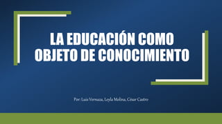 Este documento trata sobre la educación como objeto de conocimiento. Explica que la educación es un proceso de socialización y perfeccionamiento que implica la acción del educador y el educando a lo largo de toda la vida, no solo en las etapas escolares. También define la pedagogía como la ciencia que estudia los métodos de enseñanza y los mecanismos de formación con los que una sociedad intenta formar ciudadanos desde la infancia. Por último, resume brevemente el origen y desarrollo histórico de la pedagogía
