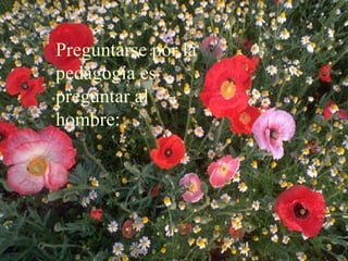Este documento discute la pedagogía y la educación como procesos de contemplar el misterio de la persona humana más que simplemente transmitir conocimiento. Argumenta que la pedagogía debe buscar comprender al ser humano de manera total e integral, incluyendo sus aspectos espirituales y misteriosos, en lugar de reducirlo a su utilidad. También enfatiza que la educación verdadera ocurre a través de la sabiduría popular, las relaciones humanas y la transmisión de libertad, más que por medio de métodos y tecnologías