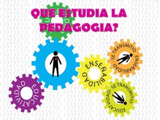 La pedagogía es la ciencia que estudia la educación. Tiene sus fundamentos en los estudios de Kant y Herbart y es una disciplina perteneciente a las ciencias sociales y humanas. Su objeto de estudio principal es la educación y cómo diferentes ciencias como la historia, sociología y psicología pueden ayudar a comprenderla. La pedagogía analiza la educación como un proceso que permite la incorporación de individuos a la sociedad y el desarrollo de su potencial.