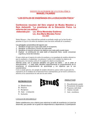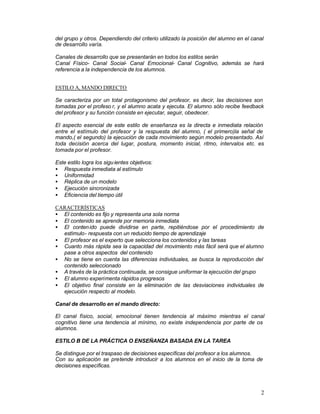Este documento resume los diferentes estilos de enseñanza propuestos por Muska Mosston y Sara Ashworth. Describe los 10 estilos que van desde el estilo de mando directo (A) hasta el de auto-enseñanza (J). Cada estilo se caracteriza por el rol del profesor y los alumnos, los objetivos que persigue, y su contribución al desarrollo físico, social, emocional y cognitivo de los alumnos. Los primeros 5 estilos (A-E) cumplen objetivos de reproducción mientras que los últimos 5 (F-J)