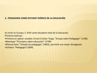 Este documento resume la evolución de la pedagogía como ciencia. Comenzó como un estudio teórico de la educación en Europa en el siglo XVIII. En el siglo XIX, Herbart estableció la pedagogía como un estudio científico sistemático del fenómeno educativo. Existen diferentes posiciones sobre si la pedagogía es una ciencia, arte, técnica y filosofía. Algunos argumentan que es una ciencia autónoma, mientras que otros ven a la pedagogía como parte de varias ciencias de la
