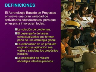 El documento describe el aprendizaje basado en proyectos, una pedagogía que involucra la solución de problemas reales, la elaboración de productos originales, y el trabajo en equipos interdisciplinarios. Requiere que los estudiantes desarrollen proyectos en entornos reales, definan claramente sus aprendizajes y procesos, y se motiven intrínsecamente. Los docentes interactúan con los estudiantes y articulan la teoría con la práctica a través de la reflexión crítica y la exploración de nuevas estrateg