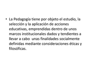 La pedagogía es el estudio sistemático y científico de la educación, cuyo objetivo es plantear, estudiar y resolver problemas educativos de manera ética y filosófica. La pedagogía pertenece al orden teórico del conocimiento de los métodos educativos, mientras que la educación se refiere a la acción práctica de educar. Finalmente, el objeto central de estudio de la pedagogía es el proceso de la educación.