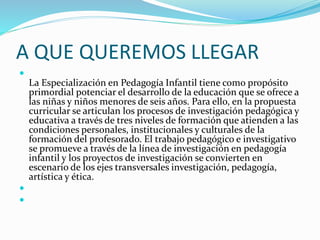 Este documento describe los objetivos de una especialización en pedagogía infantil. Su propósito es mejorar la educación de niños menores de 6 años mediante la integración de la investigación pedagógica y educativa en tres niveles de formación. Los proyectos de investigación se convierten en el escenario para ejes transversales como la investigación, pedagogía, arte y ética. Los objetivos generales son articular la formación del profesorado con procesos de investigación en pedagogía infantil y contribuir a mejorarla a través de dichos
