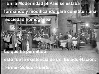 El documento describe la transición de una sociedad homogénea a una sociedad de consumo. En la modernidad, el estado-nación creó instituciones y símbolos para formar una identidad ciudadana uniforme. Sin embargo, la globalización ha debilitado el estado-nación y ha dado lugar a una subjetividad dominada por los medios de comunicación masivos en lugar de las instituciones. Esto ha creado un choque con el sistema educativo, que ya no coincide con la forma en que los niños aprenden a través de los medios.