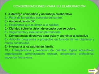 El documento describe los componentes y consideraciones para la elaboración del Plan Escolar de Desarrollo Educativo (PEDE) y el Programa Anual de Trabajo (PAT) con el objetivo de mejorar los procesos de enseñanza y aprendizaje. El PEDE y el PAT tienen un enfoque sistémico que impulsa un proceso de mejora continua basado en la autoevaluación, los estándares de calidad y la participación de toda la comunidad escolar.