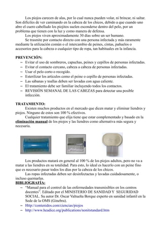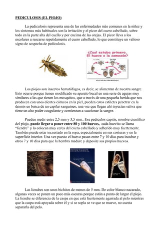 Este documento describe la pediculosis (piojos), una enfermedad común en niños. Los síntomas incluyen picazón e irritación en el cuero cabelludo. Los piojos se alimentan de sangre a través de agujas similares a las de los mosquitos. No pueden volar, pero se esconden en el pelo para evitar la luz. Se transmiten a través del contacto directo con personas infectadas o el intercambio de artículos como peines o ropa. El tratamiento implica la eliminación manual de piojos y liendres