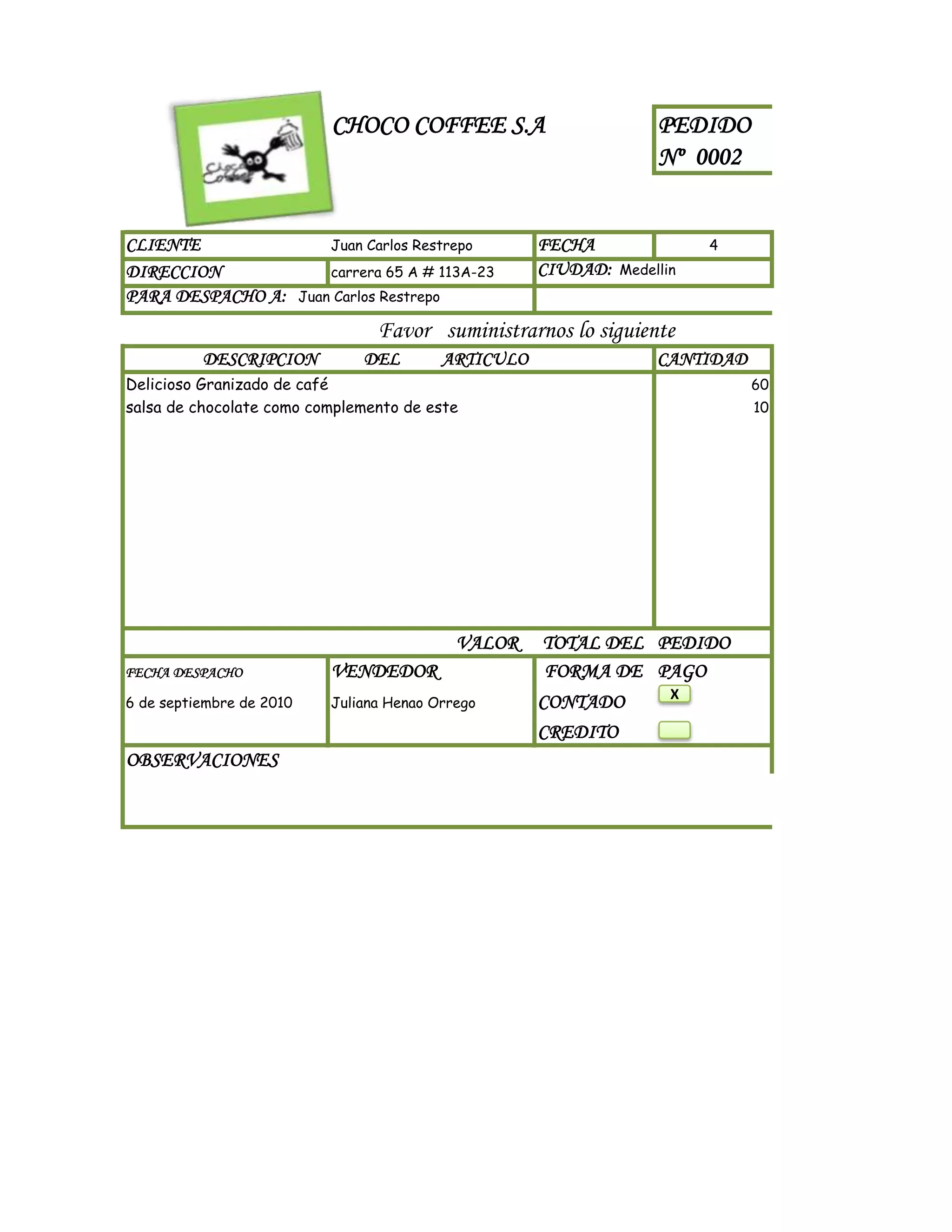 El pedido número 0002 de Choco Coffee S.A. es para Juan Carlos Restrepo de Medellín. El pedido incluye 60 unidades de Granizado de café Delicioso a $3,000 cada uno para un total de $180,000 y 10 unidades de salsa de chocolate como complemento a $1,500 cada una para un total de $15,000, sumando un valor total de $195,000. El pedido será despachado el 6 de septiembre por Juliana Henao Orrego y se pagará al contado.