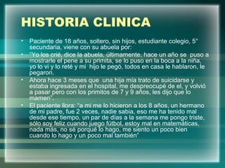 Este documento presenta el caso clínico de un paciente de 18 años que ha cometido actos de pedofilia. El paciente fue abusado sexualmente cuando era niño y ahora ha abusado de sus primos menores de edad en dos ocasiones. El documento detalla la historia clínica y el tratamiento psiquiátrico del paciente a lo largo de varios meses, incluyendo medicamentos para la depresión y la agresividad. A medida que continúa el tratamiento, el paciente informa una mejora en sus síntomas y una disminución en