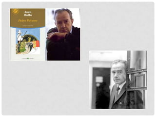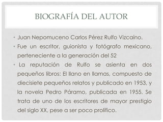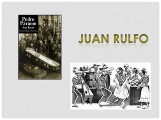 Este documento resume la biografía y obra literaria del escritor mexicano Juan Rulfo. Se destaca que Rulfo perteneció a la generación literaria de 1952 y que sus dos obras más importantes fueron El llano en llamas y la novela Pedro Páramo. La novela Pedro Páramo se considera una de las mejores obras de la literatura hispánica del siglo XX y presenta elementos del realismo mágico al combinar lo real y lo fantástico.