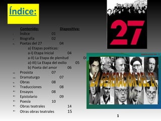 El documento resume la biografía y obra del poeta español Pedro Salinas. Aborda las diferentes etapas de su vida y carrera poética, incluyendo sus principales libros de poesía como La voz a ti debida y sus traducciones de autores como Proust. También menciona su trabajo como ensayista y dramaturgo durante su exilio en Estados Unidos tras la Guerra Civil Española.