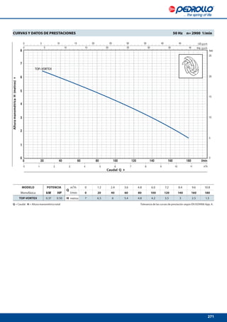 Este documento describe una bomba sumergible para drenaje de aguas sucias llamada TOP-VORTEX. Es adecuada para uso doméstico como vaciado de aljibes y depósitos con sólidos en suspensión de hasta 20 mm. Incluye especificaciones técnicas como caudal máximo de 180 l/min, altura manométrica hasta 7 m, y temperatura máxima de 40°C. El documento también proporciona detalles de construcción, curvas de rendimiento, dimensiones y certificaciones.