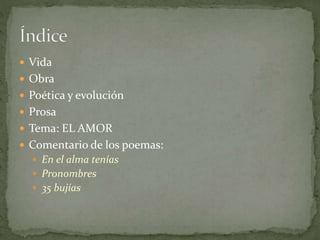 Este documento presenta una biografía y análisis de la obra poética de Pedro Salinas. Se divide su trayectoria en tres etapas influenciadas por el futurismo, el amor y el exilio. Destaca su trilogía amorosa inspirada en Katherine Whitmore y cómo explora el amor como fuerza que da sentido a la vida. Su estilo se caracteriza por la condensación de conceptos y diálogo con lo absoluto.