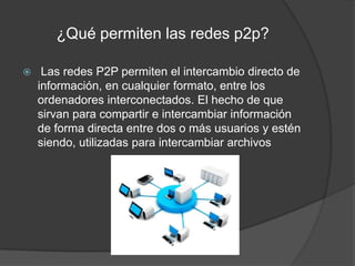 Las redes P2P permiten el intercambio directo de archivos e información entre computadoras conectadas. Aprovechan el ancho de banda de los usuarios para transferencias más eficientes que con métodos centralizados. Son escalables y robustas, ya que no tienen un punto único de falla al replicar datos en múltiples nodos.