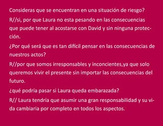 Este documento discute la situación de Laura y Andrés y si se encuentran en riesgo debido a sus acciones irresponsables e inconscientes. Laura corre el riesgo de quedar embarazada si continúa teniendo relaciones sexuales sin protección con David, y las adicciones de Andrés podrían arruinar su proyecto de vida.
