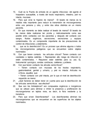 El documento define varios términos clave relacionados con el control de infecciones como colonización, infección, contaminación, reservorio, puertas de entrada y salida de agentes infecciosos. También describe medidas importantes para prevenir la transmisión de infecciones como el lavado de manos, uso de equipo de protección personal, clasificación y eliminación adecuada de residuos infecciosos y conceptos como desinfección, esterilización, antimicrobianos y asepsia.