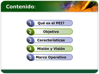 El documento presenta el Plan Educativo Institucional (PEI) de la Fundación Colombiana de Educación Continua (FCECEP). El PEI describe la misión, visión y valores de la institución, así como sus programas académicos alineados con su misión de formar sujetos comprometidos con su desarrollo personal y capaces de liderar procesos de transformación social. El PEI también presenta el marco operativo de la FCECEP, el cual integra las funciones de investigación, docencia y responsabilidad social para contribuir a la formación integral de