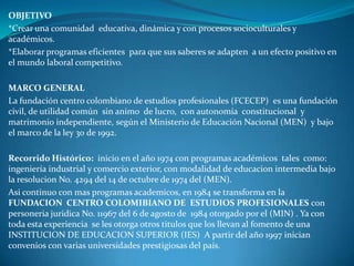 El documento presenta el Proyecto Educativo Institucional (PEI) de la Fundación Centro Colombiano de Estudios Profesionales (FCECEP). El PEI busca crear una comunidad educativa dinámica con programas que se adapten al mundo laboral. La FCECEP ofrece educación basada en valores y conocimientos para formar sujetos responsables. Siguiendo modelos pedagógicos constructivistas, busca desarrollar competencias en los estudiantes a través de currículos flexibles.