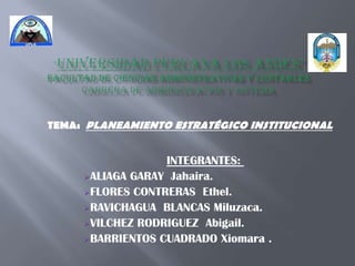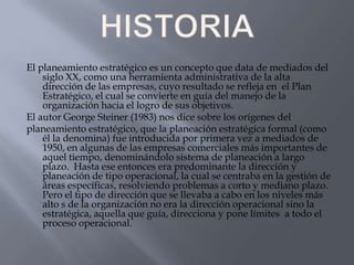 El documento presenta información sobre el planeamiento estratégico institucional. Define el planeamiento estratégico y sus características. Explica que es un proceso que permite establecer un sentido de dirección y orientar el trabajo hacia objetivos futuros. Finalmente, destaca que en la Facultad de Administración y Sistemas permitirá dar sentido de dirección según el entorno y orientar el trabajo del personal hacia objetivos claros.